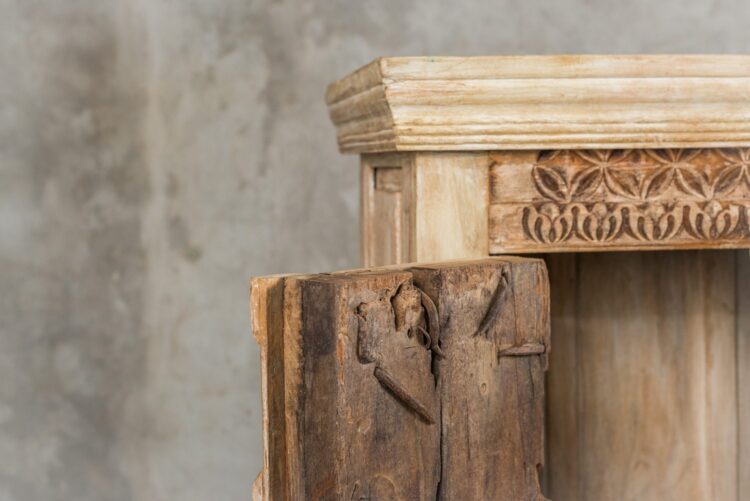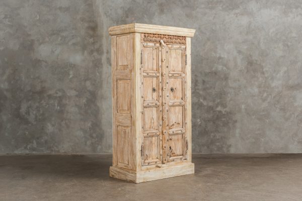 Alacena fabricada en India con madera de teca al natural tallada y con aplicaciones de fierro.