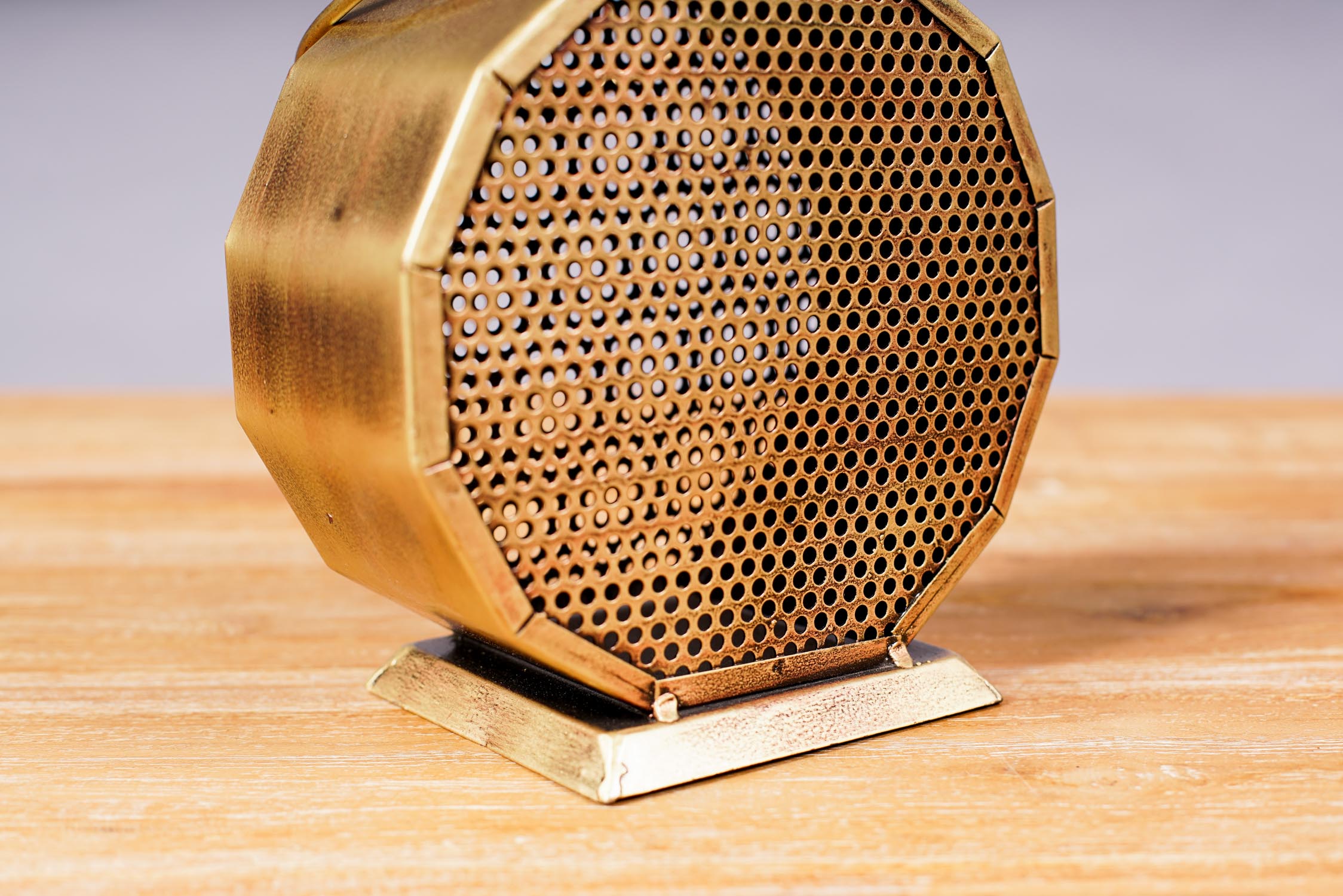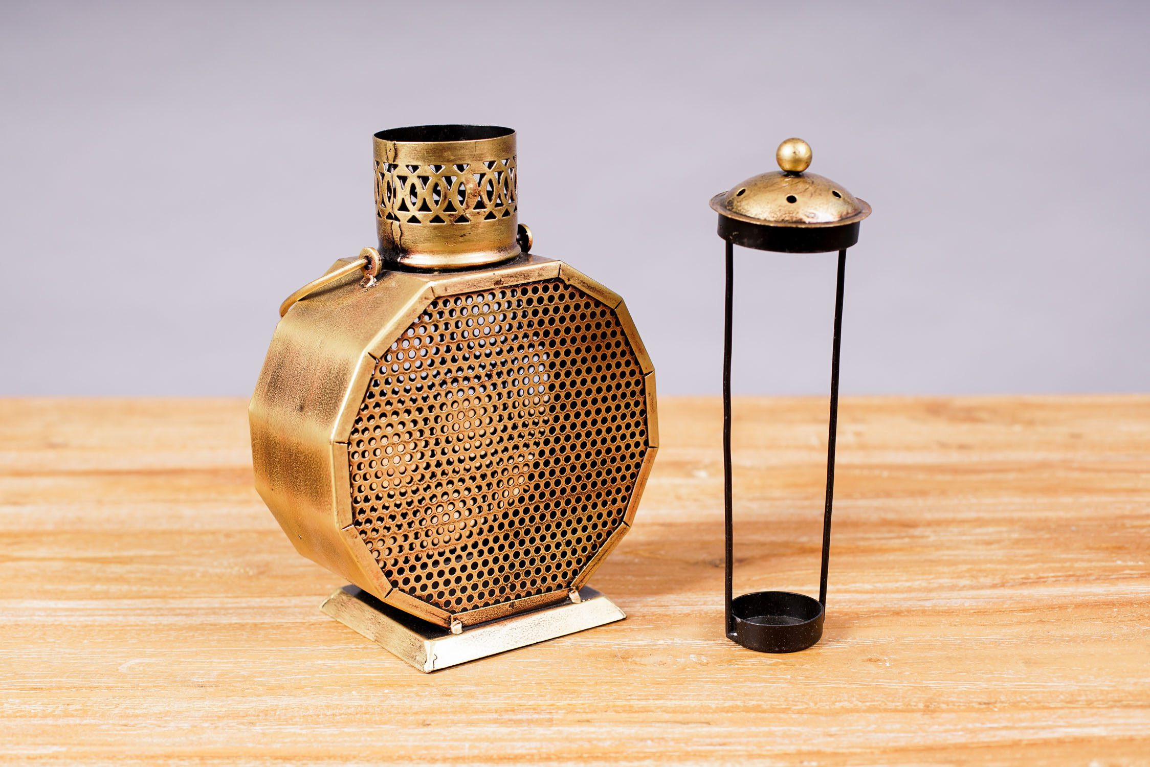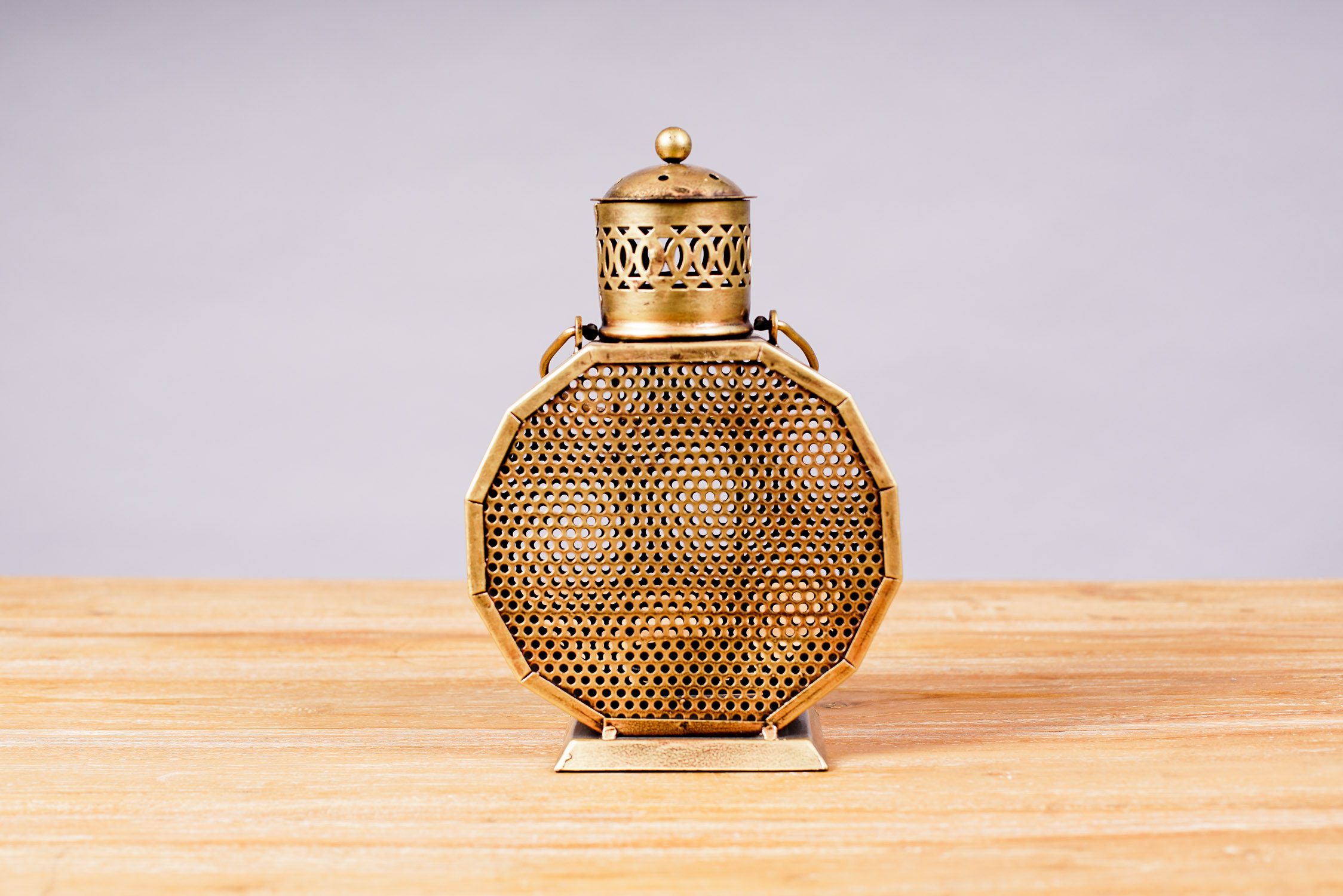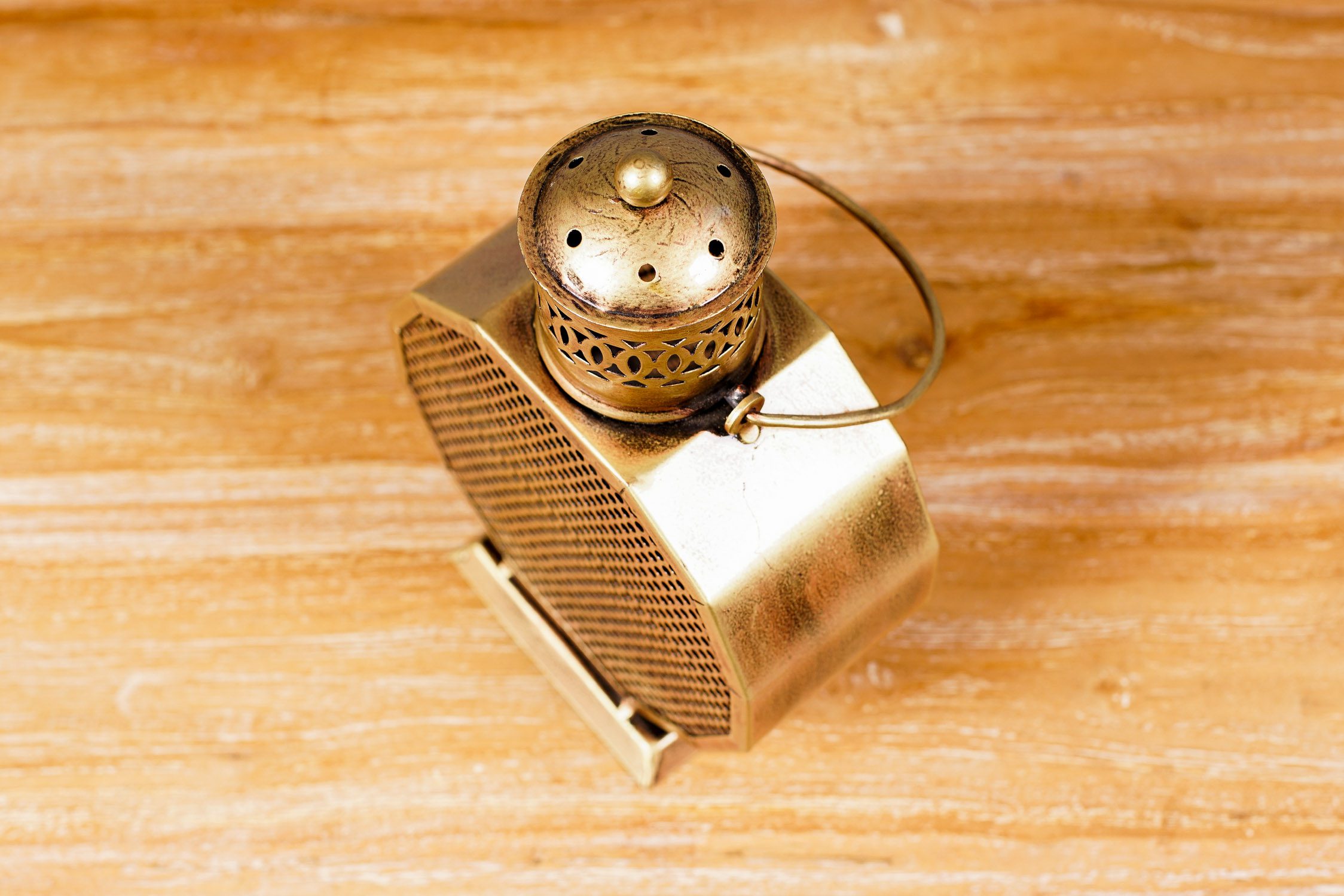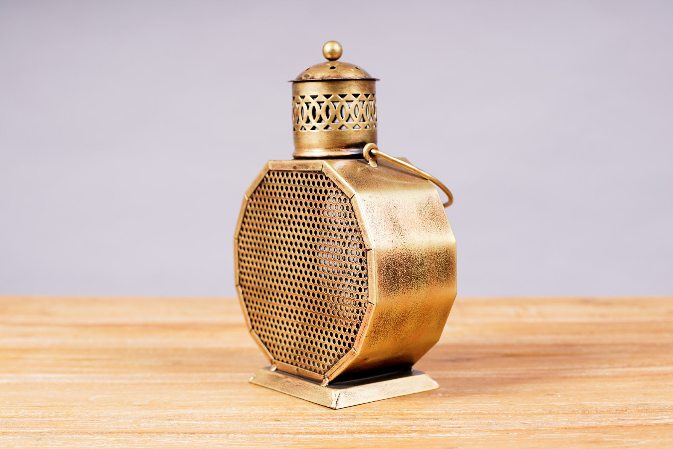 Farol porta vela de metal tallado y pintado color dorado. Sus rendijas hacen que la luz se filtre y se proyecte según los agujeros. Para poner sobre superficies o colgar.