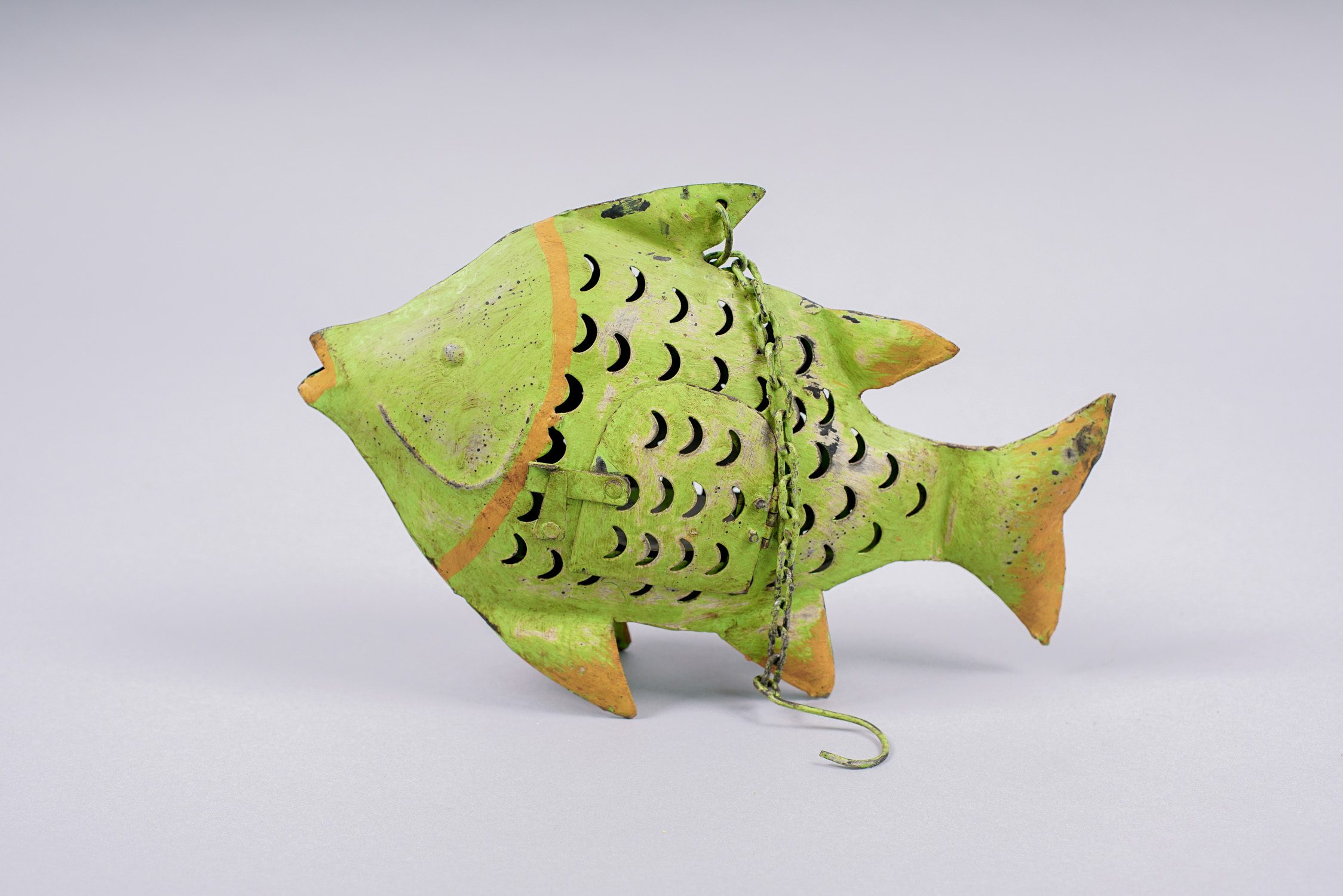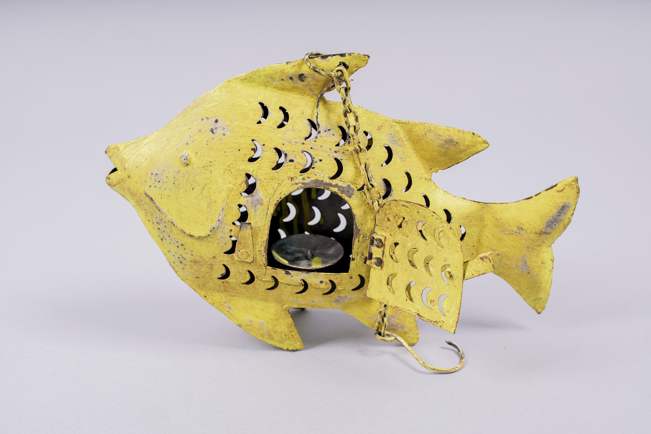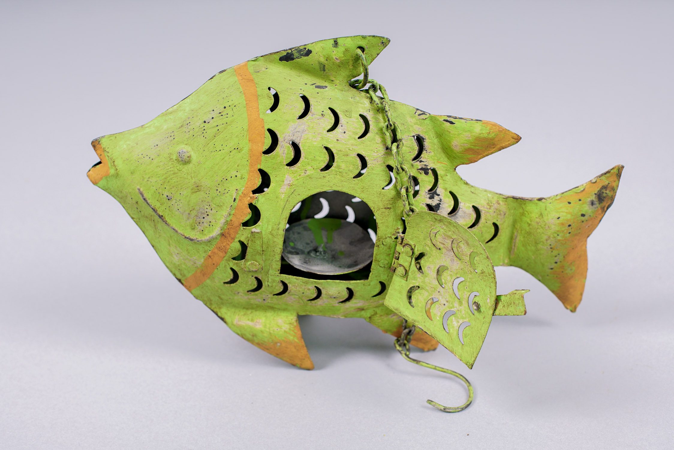 Figura de pescado Globo/ candelabro fabricada en metal de origen Indio. Que tu hogar no prescinda absolutamente de ningún detalle de tu mano decoradora. Tenemos una línea de esculturas de diversos animales que puedes elegir.